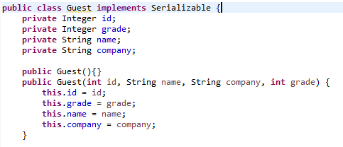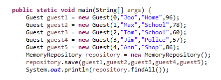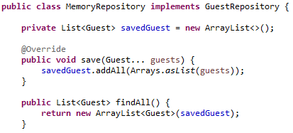 그리고 이러한 Guest들은 MemoryRepository라는 클래스에 save함수를 통해 savedGuest라는 변수에 각각 담기게 된다.