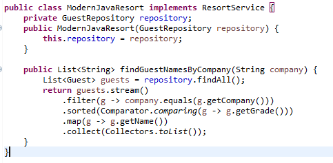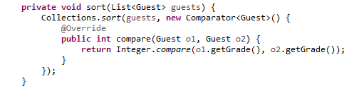 위의 경우에는 Guest를 담고 있으므로 Comparator<Guest>를 생성하고 익명 객체에 바로 compare를 오버라이딩 해주었다.