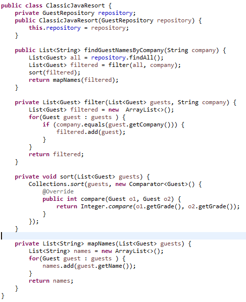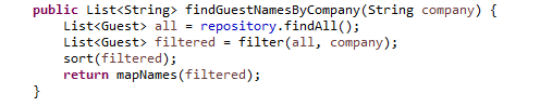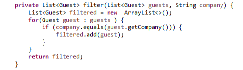 이후 List<Guest> all 에 담긴 게스트들을 하나씩 꺼내서, company(찾고자 하는 회사명)와 guest.getCompany(게스트의 회사명) 이 동일한지 체크하여 맞는 값만 filtered에 담아 리턴한다.