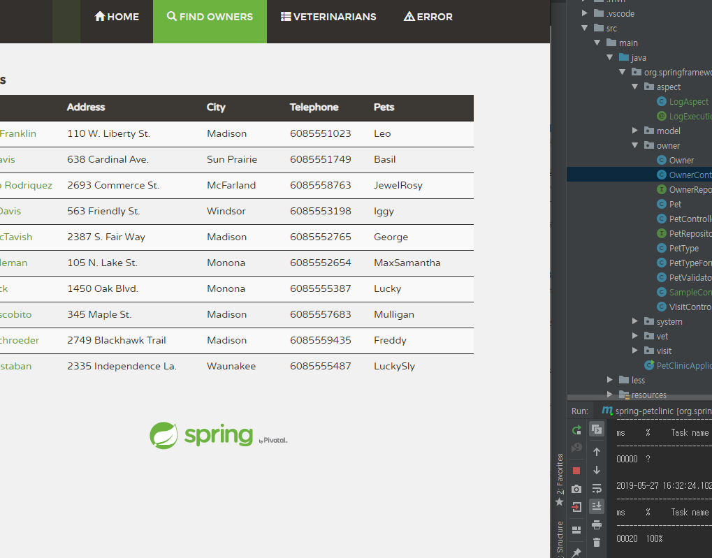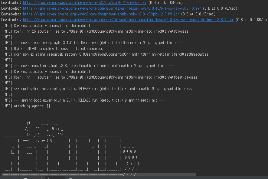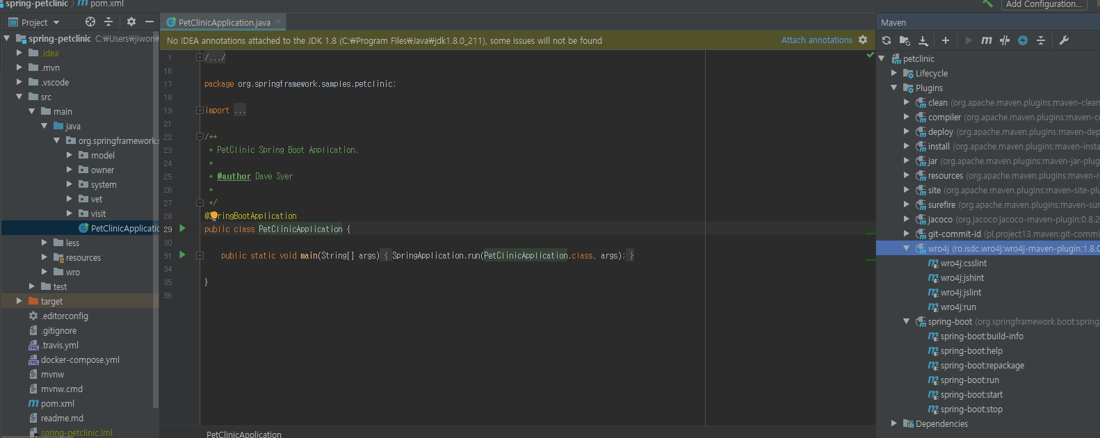 실행 방법은 첫번째로 오른쪽의 plugin 부분에서 wro4:run 혹은 spring-boot:run 을 더블 클릭하거나 콘솔창에서 실행할 수 있다.