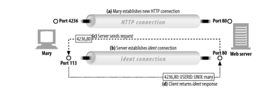 ident는 프로토콜이다. 그렇기 때문에 클라이언트는 HTTP 연결을 서버와 한 후에 서버는 클라이언트에 ident 서버 포트를 향해 연다. 하지만 안전하지 않고 클라이언트가 ident를 설치해야 한다는 점에서 서비스에는 사용되지 않는다.