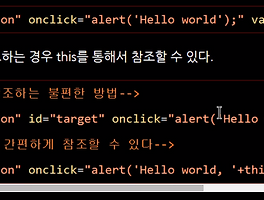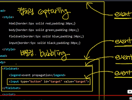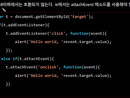 Language (58) 썸네일형 리스트형 [Javascript] Form Form 은 사용자가 입력한 정보를 서버로 전송하게 해주는 HTML태그 이벤트 1. submit 입력한 값을 제출 하는 이벤트를 가진다. 위의 예시는 입력한 값이 없을 때 제출하게 되면 경고창이 뜨게 하는 코드이다. 일단 폼 태그의 엘리먼트를 t라는 객체로 확보하고 t에 이벤트 리스너 메소드를 이용한다. ( 폼의 이벤트 리스너 속성) 그리고 첫번째 인자는 폼태그의 속성값중 하나인 submit 두번째 인자는 함수를 입력한다. 조건문을 이용하여 value 프로퍼티의 길이가 0인지 확인 하여 처리한다. event.prventDefault는 이벤트의 작동을 중지시키는것! 2. change 만약 input의 값이 변화했을때 발생하는 메소드 form태그 하위 태그인 input태그 엘리먼트를 변수 t에 저장하고 이벤.. [JavaScript] 브라우저 이벤트 기본동작의 취소 웹 브라우저의 구성요소들은 각각 기본적인 동작방법을 가지고 있다. 예를 들면 텍스트 필드에 포커스를 준 상태에서 키보드를 입력하면 텍스트가 입력되고 폼에서 submit 버튼을 누르면 데이터가 전송되며 a 태그를 클릭하면 href 속성의 URL로 이동한다. 방법은 다음과 같다.체크 박스가 True라면리턴값을 false값을 준다. 이는 태그의 이벤트를 마비시키는 역할을 한다. 이벤트 연습해보자 프로퍼티 리스너프로퍼티 리스너 방식. 특이점은 없다. 이벤트 리스너특이한거 있다. return false가 아닌event.preventDefault(); 이벤트 객체에 preventDefault()를 호출한다. [JavaScirpt]버블링과 캡처링 만약 input태그 fieldset태그 body태그 html태그에 eventListener를 부여했다고 하자. 그럴때 input의 event를 실행시키게 되면 event의 영역인 fieldsetfieldset의 영역인 bodybody의 영역인 html이각각 실행 될 것이다. 이것이 위에서 아래로 진행된다면 캡쳐링 아래에서 위로 진행된다면 버블링이다. 1. 캡처링다음은 캡처링의 예제이다. 결과는 위 코드와 같은데 콘솔부분만 설명해보자면event.target.nodeName은 그 이벤트(마우스클릭)의 타겟이된 객체의 노드네임을 호출하고this.nodeName은 이벤트(핸들링?리스너?)가 실행된 노드네임을 호출한다. 그리고 결과값으로 다음과 같이 나오는데여기서 HTML BODY FIELDSET INPUT순으로.. [JavaScirpt]이벤트 등록(addEventListener) 1. addEventListener사용방식은 위의 코드와 같다.1.이벤트리스너를 달아줄 객체 = t그리고 괄호는 순서대로(이벤트, 리스너)이다. 해석해보면객체t에 이벤트리스너를더하는데(클릭이벤트를통해서이고, 경고문을 출력하는 기능이다.)이다. 2. 이벤트 리스너를 쓰는 이유 위의 코드는 프로퍼티 리스너이다.이 프로퍼티 리스너는 한 객체의 이벤트에 하나의 리스너밖에 가질 수 없다. 고로 클릭이벤트 발생시에 alert(2)만 출력 될 것이다. 그래서 위의 코드와 같이 이벤트 리스너를 쓰는것을 권장한다. 클릭이벤트 발생시에alert(1)과 alert(2)가 동시에 실행된다. 3. 하나의 리스너로 여러 이벤트리스너 실행하기. t1과 t2 다른 객체이지만하나의 리스너를 사용하고 있다. [JavaScirpt]이벤트 등록 1. inline방식 태그에 이벤트를 설치하는 방식 예시 onclick="alert('Hello world') 그런데 아래 4번째 라인을 살펴보자 this.value를 호출하라고 되어있는데 여기서 this란 함수가 속해있는 객체를 의미한다. 고로 4번째 라인은 alert함수가 속해있는 태그 엘리먼트, 객체의 value값을 출력하게 되어진다. 2.프로퍼티 리스너 해석 t라는 변수에 target이라는 id를 가진 태그를 리턴하고 그 t라는 객체에 onclick이라는 약속된 자바스크립트 객체 속성에 함수를 지정해서 그 함수를 실행시킨다. 다음 빨간 박스가 이벤트핸들러이다. 그리고 이 이벤트핸들러는 첫번째 파라미터로 이벤트 객체라는 것을 전달 받기로 약속되어 있음. 이 이벤트 객체는 프로퍼티로 타겟이라는것을 가.. [JavaScript] 이벤트 용어 용어 정리 event : 무언가 행위가 발생할 때, 실행되는 행위 eventTarget : 이벤트가 일어날 행위의 대상 (예를 들어 버튼) eventType : ~했을 때(onclick, onchange와 같은 것) eventHandler : ~했을 때 일어나는 행위(alert와 같은것) [JavaScript]Element의 위치 및 크기 알아내기 var t = document.getElementById('target');console.log(t.getBoundingClientRect()); 위 코드에서 getBoundingClientRect()메소드는 콘솔에 이런 값을 리턴하는데 이는 위치와 크기에 관한 리턴값이다. 위의 사각형이 target엘리먼트의 형태인데 top과 bottom left right는 각각 BODY태그에서 얼마나 떨어져 있는지 width와 height는 엘리먼트의 텍스트 노드 + 패딩값 + 보더값을 나타낸다. 만약 엘리먼트가 중첩되어 있다면 어떻게 될까?위와 같이 엘리먼트를 중첩했을 때 coding 엘리먼트와 문서와의 거리는 200px이다. getBoundingClientRect를 호출해보자. 뭐 결과는 같다. 예외가 있다면 t.. [Javascript] Text API 총 네가지 API를 살펴보자 첫번째 버튼은 callAppendData()라는 함수를 호출한다. callAppendData는 target엘리먼트에 appendData 메소드를 실행한다. appendData는 data.value를 파라미터로 두는데 이는 첫번째 input박스의 value값이다. 결론적으로 Cording everybody!(target엘리먼트) 뒤에 value값이 추가된다. 두번째 버튼은 callDeleteData()라는 함수를 호출한다. target엘리먼트에 deleteData 메소드를 실행한다. deleteData메소드는 첫번째 값 두번째 값 모두 정수를 파